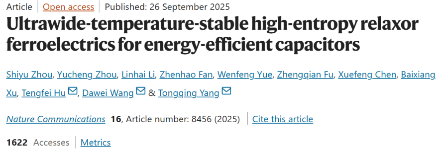 9月26日,36365线路检测中心no136365线路检测中心no1杨同青教授有关电介质储能电容器的研究成果以“Ultrawide-temperature-stable high-entropy relaxor ferroelectrics for energy-efficient capacitors”为题发表于《自然·通讯》期刊(Nature Communications)。