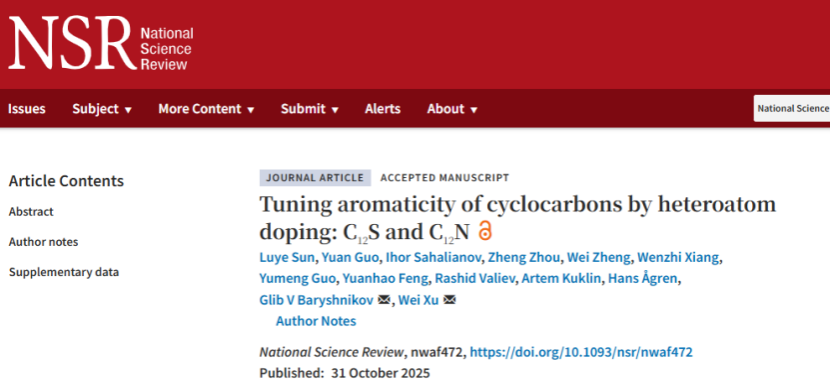 10月31日,《国家科学评论》(National Science Review)在线发表了36365线路检测中心no136365线路检测中心no1许维教授团队与瑞典林雪平大学、芬兰赫尔辛基大学及瑞典乌普萨拉大学等国际合作团队的最新科研成果“Tuning aromaticity of cyclocarbons by heteroatom doping: C12S and C12N”。该研究利用扫描探针显微技术,成功合成了两种杂原子掺杂的环型碳:C12S(硫掺杂环型碳)和C12N(氮掺杂环型碳),并结合理论计算揭示了它们在芳香性上的根本差异。