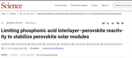 该研究成果于2026年1月1日在国际顶级学术期刊《科学》(Science)正式在线发表,标题为“Limiting phosphonic acid interlayer-perovskite reactivity to stabilize perovskite solar modules”,36365官网费成斌研究员为论文第一作者,美国北卡罗来纳大学Jinsong Huang教授是论文通讯作者。