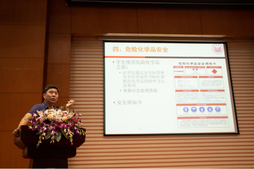 接下来,姚武老师从实验室通用安全、消防与用电安全、危化药品安全、气体和高压瓶使用安全及特种设备使用安全等五个方面,系统介绍了在实验楼进行学习和做实验时需要注意的安全隐患,并提出了学校及学院对学生的具体要求,要求学生严格遵守规章制度和操作流程,在进入实验室之前进行完备的安全教育和考核。